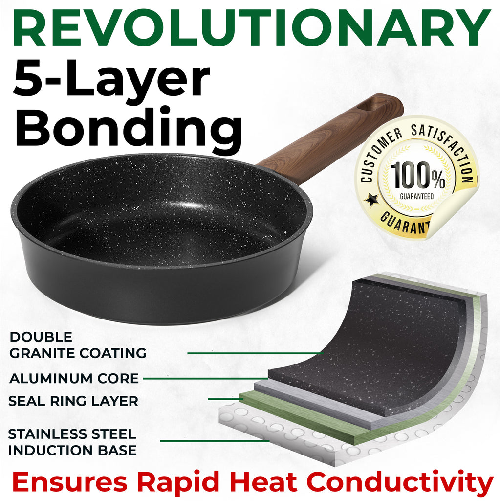 - 5-Layer Bonded Technology – Aluminium core with stainless steel induction base ensures fast and even heat distribution. Perfect frying pans for induction hob, gas, electric, ceramic cookers.