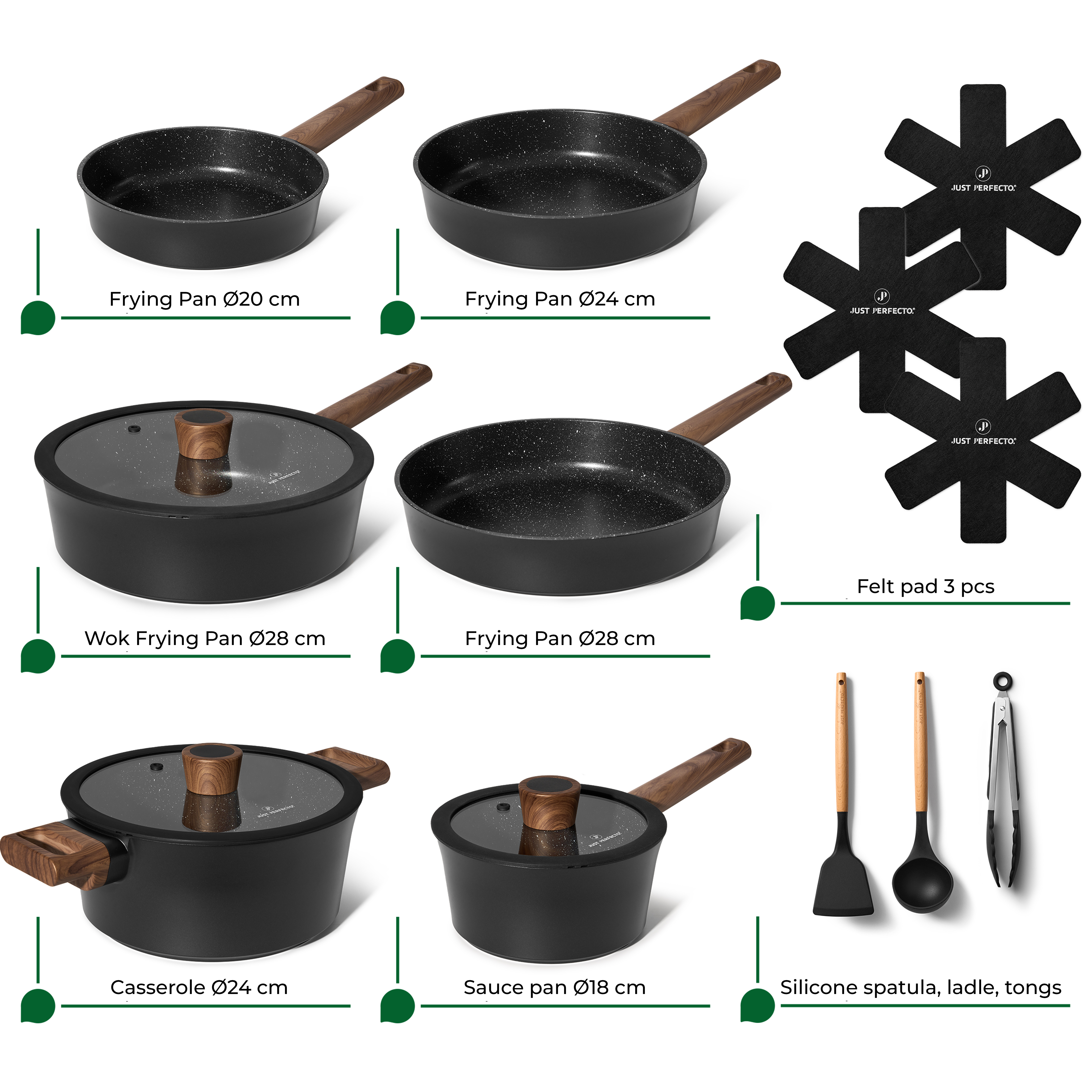 - Stylish & Practical Design – Modern black stone effect cookware with ergonomic wood-effect handles. Heat-resistant, comfortable and safe. Ideal as a non stick saucepan set with lids, a wok pan, or as a complete cookware gift set.